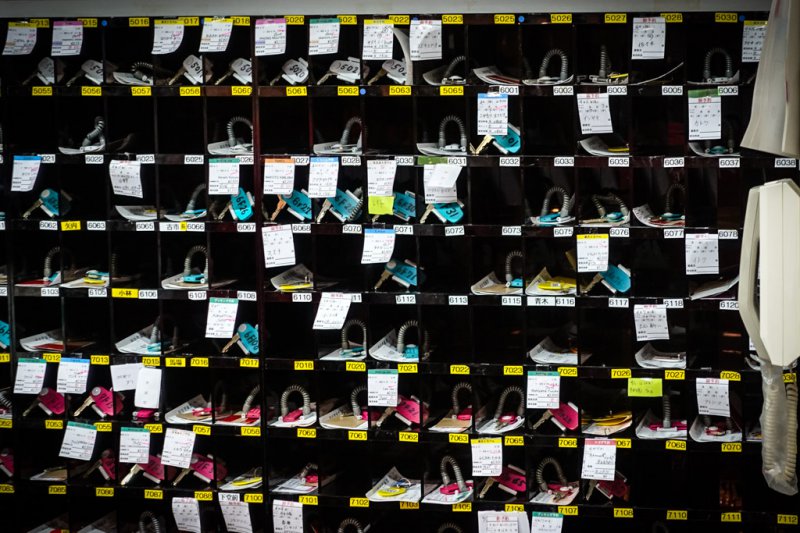 Даю работнику ресепшена квитанцию об оплате, и ключ от обуви. Он кладёт это всё в мою ячейки, а взамен я получаю пронумерованный ключ от моего шкафчика для одежды. Я не смогу выйти из отеля с этим ключом (не босиком же!), его надо будет сперва обменять на обувной.