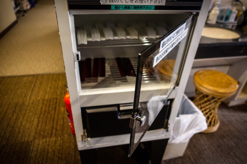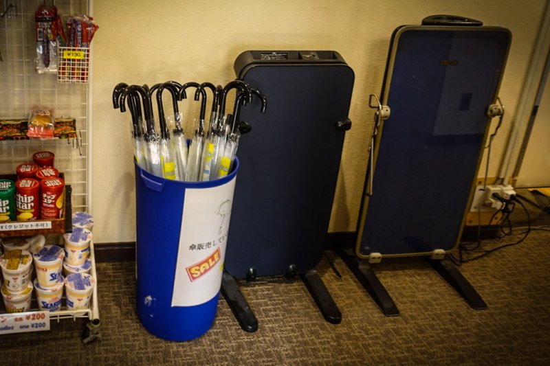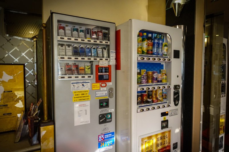 Прежде чем туда подняться, самое время оглядеться, что же тут есть возле ресепшена. Есть стандартный для Японии автомат с напитками, и чуть менее стандартный с сигаретами.
