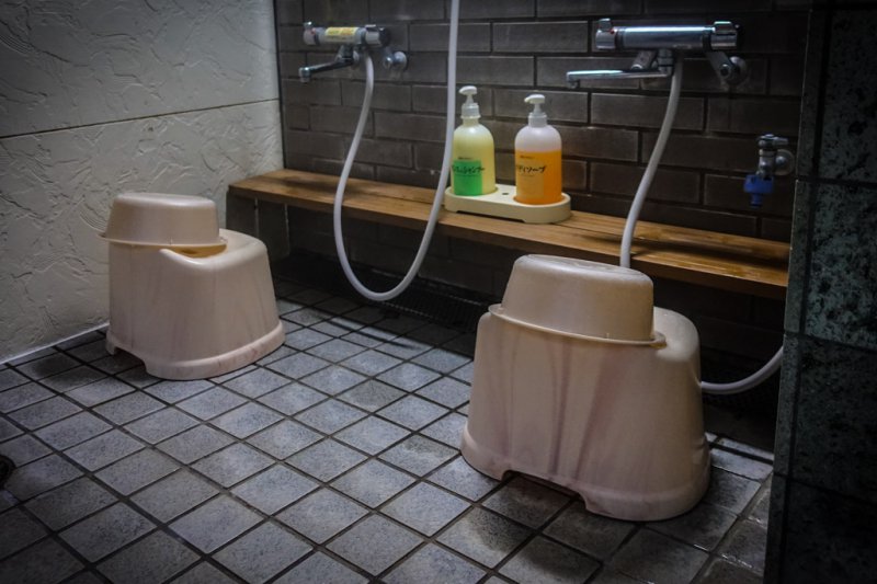 Сам онсен снимать не стал - в нём полно голых мужиков абсолютно разных мастей. Но рядом вот такие душевые станции. Садишься на табуреточку, и поливаешь себя, мылишь, растираешь, бреешься. Каждый человек обязан помыться перед тем, как лезть в воду онсена.