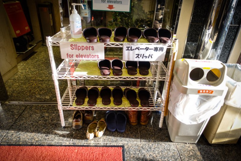 Тут же стоят тапочки, но внутри отеля нельзя ходить и в них. Надпись объясняет, что это тапочки только для езды в лифте между этажами. Ну, про то, что у японцев к тапочкам особое отношение мы с вами уже говорили.