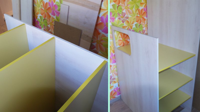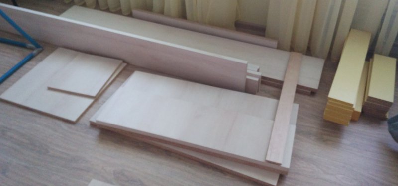 Вычислены размеры всех деталей, заказан распил. Из материалов потребовалось ЛДСП: 1 лист цвета Лимон – для фасадов, полок и ящиков; 1 лист 26 мм и 1 лист 16 мм цвета Сканди – собственно для кровати; 1 лист фанеры для основания под матрас; половина листа белой ДВП – для дна ящиков и потолка верхней кровати. Вот что получилось после распила.