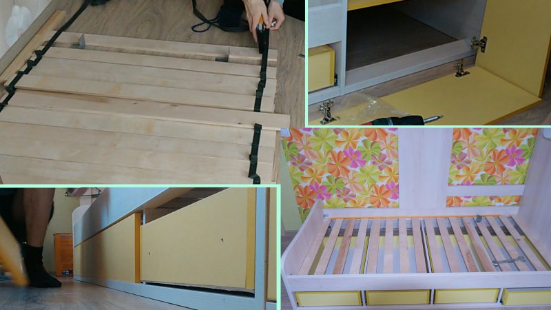 Далее собираем основание под матрас. Напиленные из фанеры рейки соединил шнуром с помощью мебельного степлера, уложил на место и крайние рейки прикрутил шурупами к кровати. К дверкам прикрутил петли и повесил на место. Фасады ящиков прикрепил с помощью двух шурупов.
