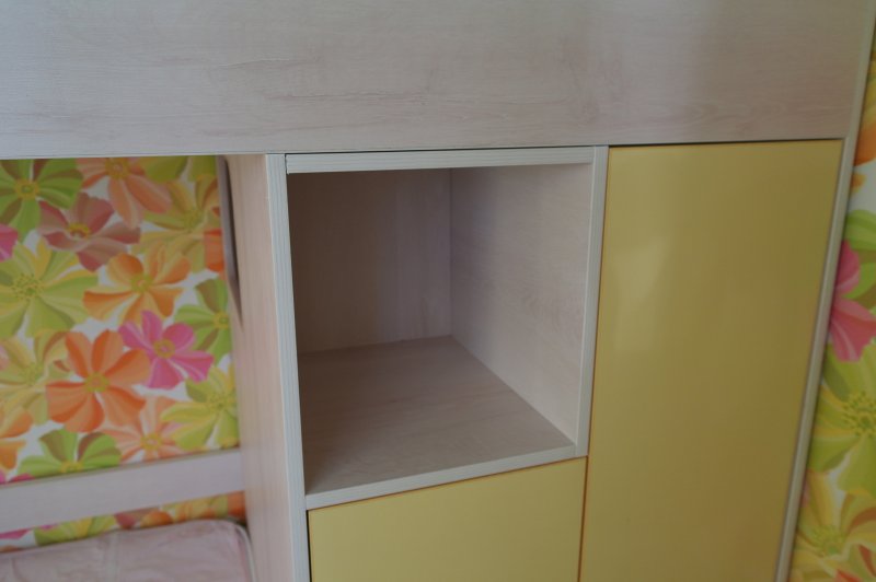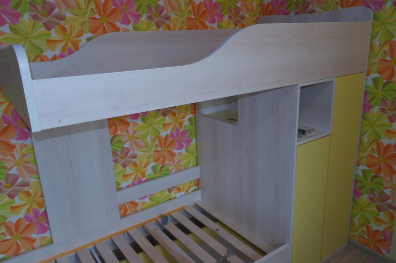 К этому шкафчику прикреплены бортики верхней и нижней кровати на евровинты. Верхние дополнительно посажены на шкант. Спинки кроватей с противоположной стороны крепил двумя уголками с каждой стороны, ниже на фото видно. Также видны рейки прикрученные шурупами, на которые в последующем ляжет основание под матрас. Пол ровный поэтому кровать без ножек, опирается всеми поверхностями через войлочный подпятник.