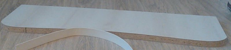 Рядом с деталью на фото лежит кромка, которая в последующем приклеена на клей момент. По опыту кухонной столешницы, где клеил им же, держит отлично. После высыхания излишки кромки снимал фрезером.