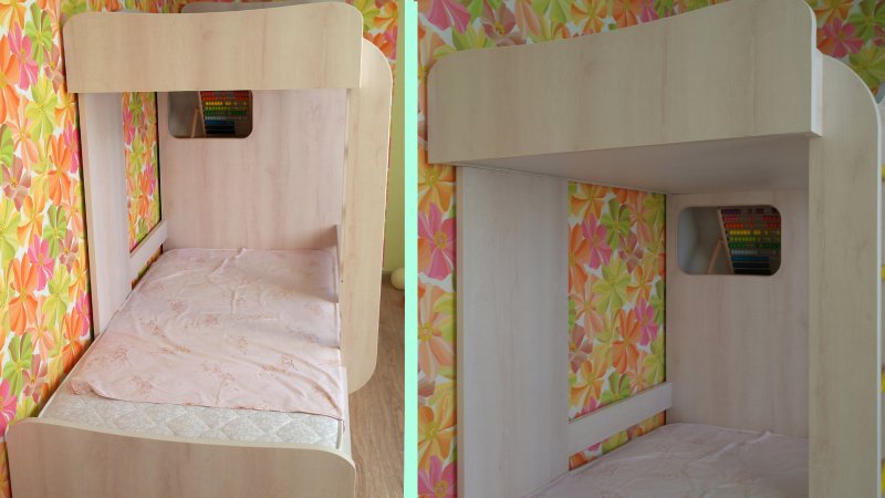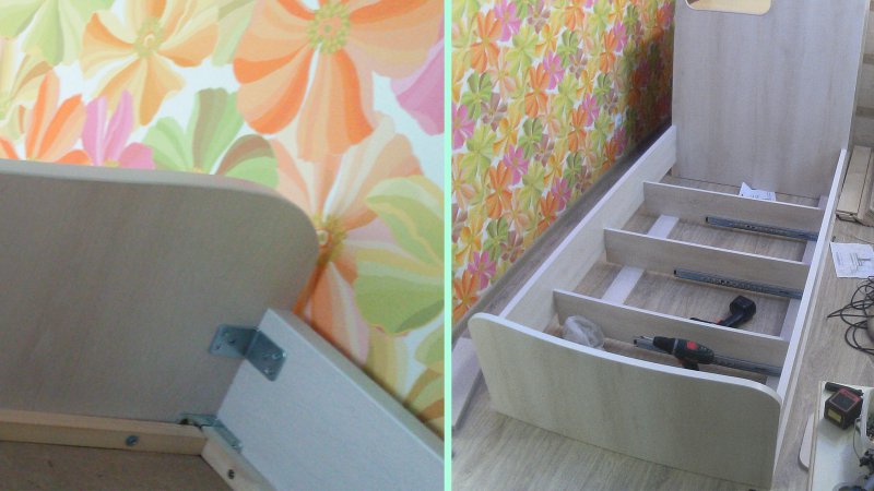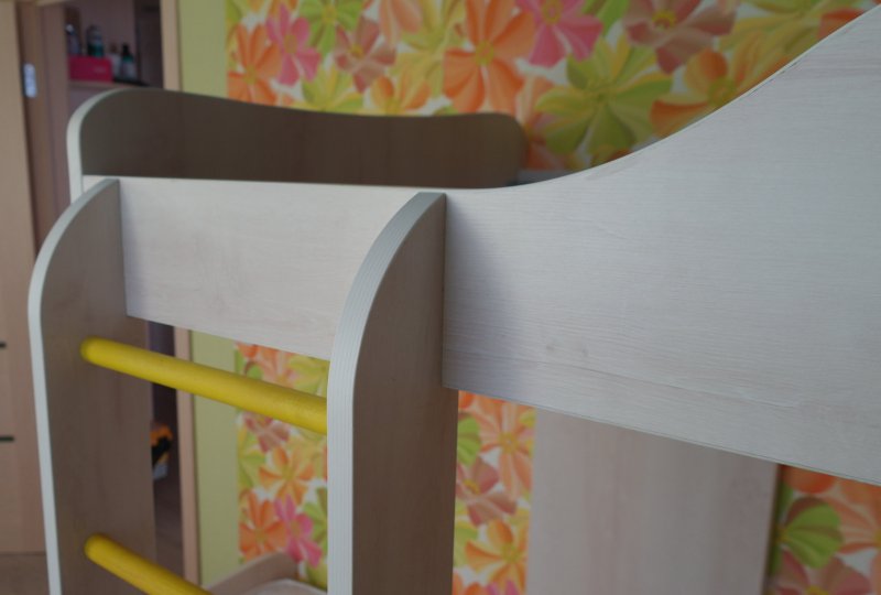 Поддерживающая верхнюю кровать доска (на нижней правой картинке) прикреплена с обратной стороны с помощью металлических пластин и шурупов, декоративная досочка отходящая от нее вправо закреплена с одной стороны на евровинты, с другой эксцентриковой стяжкой.