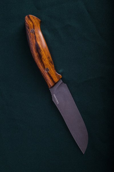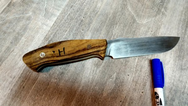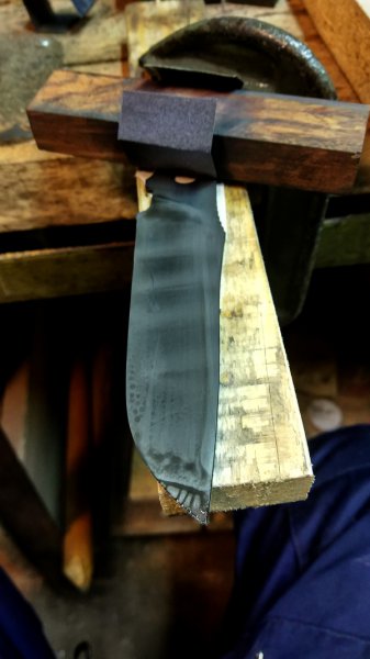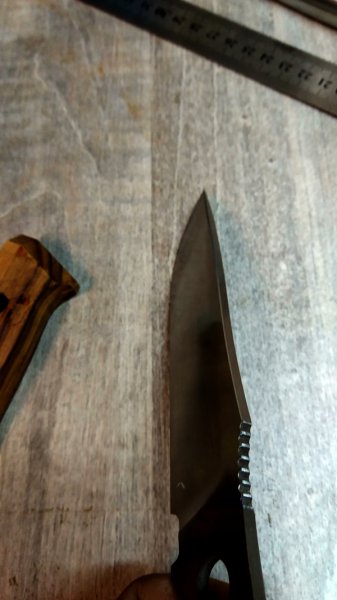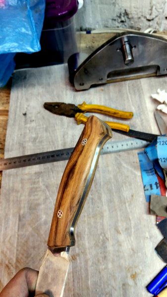 Все эти проблемы в работе были для того чтобы клинок полностью был вороненный и в стоунвоше вместе с хвостовиком. Но промах с пинами подкосил процесс реализации столь хорошей задумки. Проблема была еще и в том что сверла по каленым сталям с твердосплавной напайкой не имеют точного размера, не 7мм а 7,1мм или около того. Получилось так, что по обуху хвостовик немного выходил из рукояти, а по нижней части наоборот. Было принято решение хвостовик полировать.