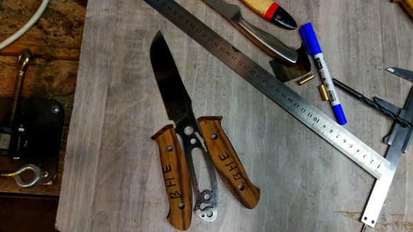 Рукоять. На этом этапе нет ничего сложного, плашки выравниваются вручную на гранитной плите с приклееной к ней наждачке с 80 зерном, склеиваются между собой, к ним же приклеивается хвостовик ножа (2-3 капли супер клея), высверливаются отверстия и контуруется по форме хвостовика.