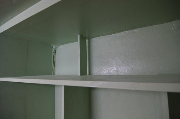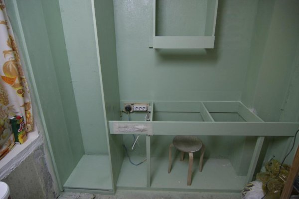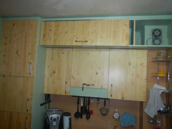Уже примерно понятно что и как. Задняя стенка антресоли скрывает вентиляцию. Кусок сверху позволяет спокойно обслуживать вентиляторы. Там же можно спрятать всякую вонючесть и ловушки от тараканов (бывали времена, у нас они бегали табунами). Стенки за средним шкафом еще нет.