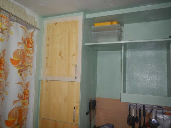 Полка под аэрогриль (когда не нужен). На данном этапе уже можно прикинуть сколько места в шкафах получилось. Там, где изначально помещались угловые полка и тумбочка сейчас стоит холодильник. И суммарно все полки уже превосходят емкость того, что было. Плюс антресоль.