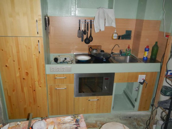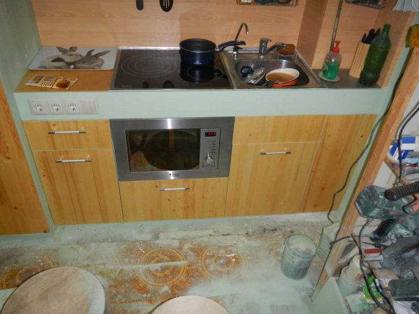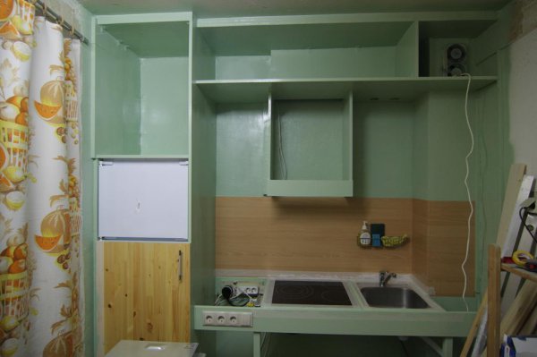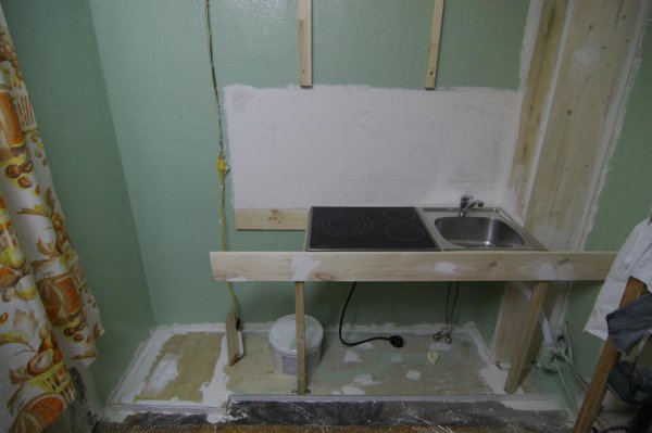 Уже примерно понятно что получается по площади. Слева подиум чуть шире - запас под холодильник. Стоит основа под плиту+раковину.