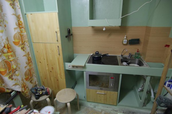 Торжественный момент примерки плиты и раковины.