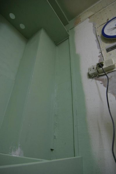 Поставил, закрепил, покрасил. Уже видно вентиляторы и справа первый из вентиляционных каналов. Пока еще только рейки. Суперидея была размазать всю вентиляцию по всей конструкции.