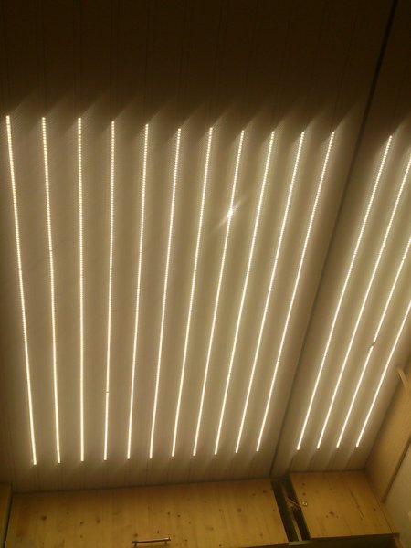 Сохранилось фото на тапок. Потолок - алюминиевые панели. Люстра выкинута вообще. Освещение 16 светодиодных полос примерно по 1,5 метра. Самые мощные, спектр на 2700К. Блок питания спрятан там же где вентиляторы. Ленты клеились на заглушки между панелями. Световой поток получился настолько мощным, что сначала я скрутил блок питания на 11 вольт, потом половину полос включил дополнительным выключателем. Сейчас примерно 40/80 ватт получается. Теплый спектр, очень похоже на лампы накаливания.