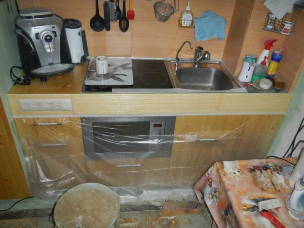 Фронтальная отделка бамбуком. Основной кран вытяжной, превращается в душ - иначе аэрогриль мыть неудобно. Кухонный фартук решил плиткой не делать. Обошелся пленкой. Поменять можно за день. Что делать с отделкой грунтованных поверхностей еще не решил. Варианты пленка или красить. Пока так, потом придумаю.