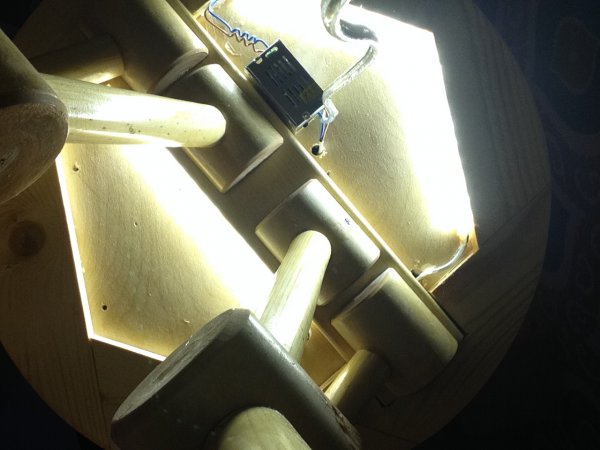 Там самый простенький диммер, чтоб лампочка на башке смотрелась мультяшнее и не слепила. Управляется левым "ухом". А вся электрика на жопе и животе этого персонажа: