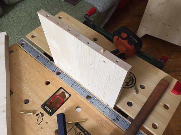 Далее закупил материал. Мебельный щит из сосны 28 и 18 мм и необходимая фурнитура. Сразу в магазине распилил по размерам, что можно было.