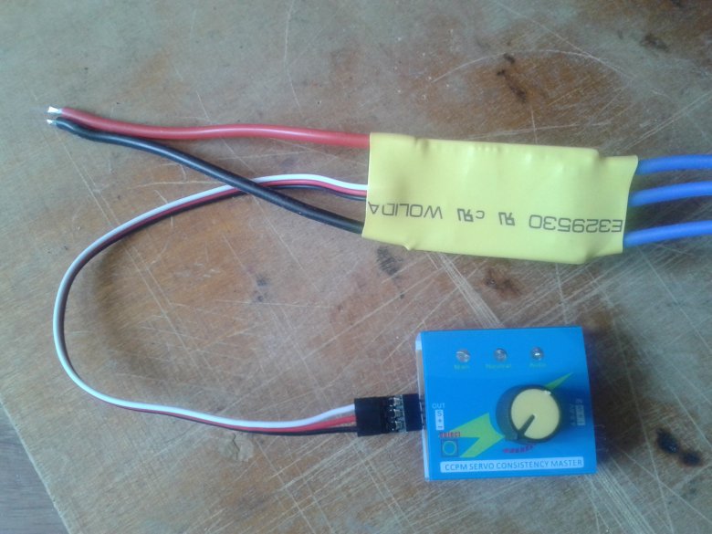 Плата контроллера требует калибровки, так что запускается это дело не мгновенно, а с задержкой секунд в 5. Судя по слухам нужно перед стартом выкрутить сервотестер на максимум, повернув ручку по часовой стрелке, чтобы все заработало как надо. Но у меня оно работает если запускать и на минимальных оборотах.