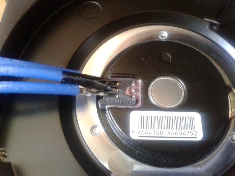 Собственно прямоугольник в желтой термоусадке - плата контроллера. Синие провода припаиваются к контактам двигателя. Порядок не имеет значения, главное, чтобы провода не контачили друг с другом, так что под центральный я кинул изоленту.