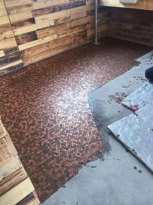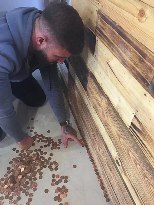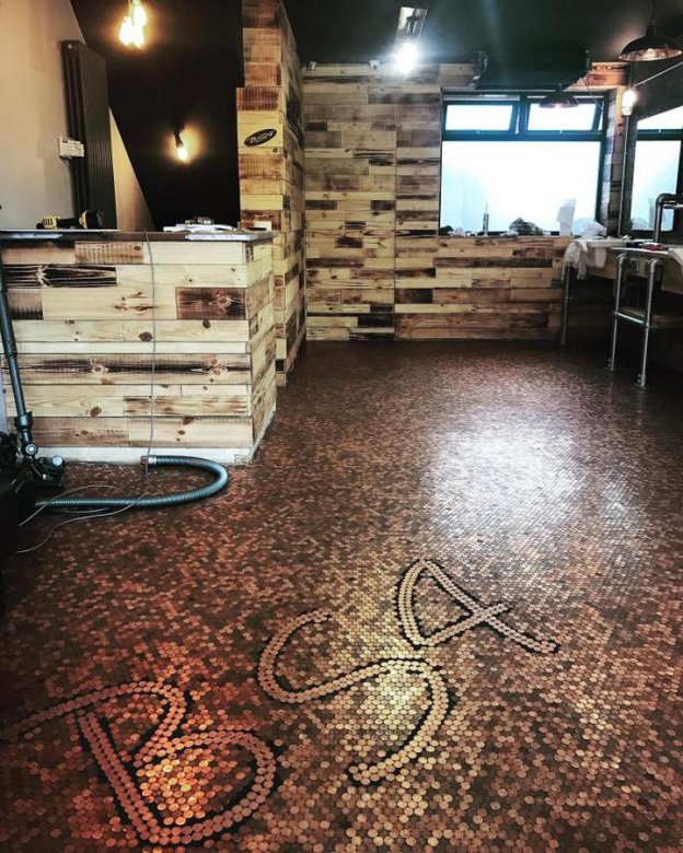 Бретт Дэвис и его команда выложили пол в парикмахерской BS4 в Бирмингеме, Уэст-Мидлендс, однопенсовыми монетами. На это понадобилось 70 000 монет, на общую сумму £700 и три с половиной месяца работы. Они остались очень довольны таким решением, результат стоит каждого пенса.