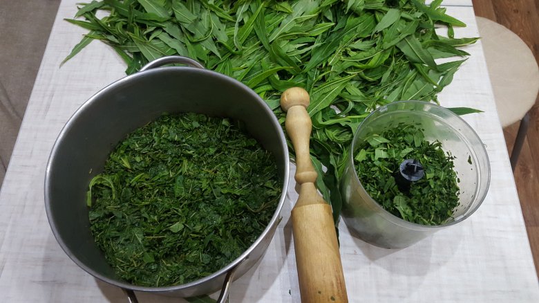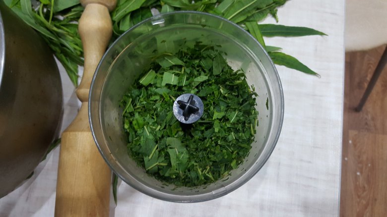 Подвяленные листья сначала режем ножом, затем измельчаем в блендере без фанатизма. Первичное мельчение ножом нужно, чтобы длинные листья не наматывались на ось с ножами.