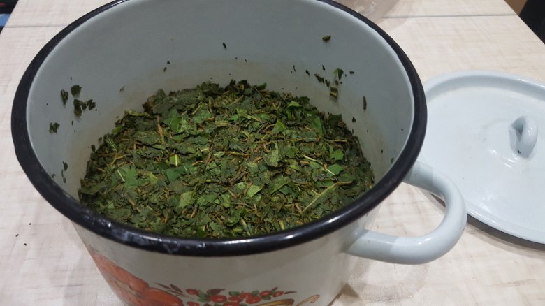 Измельченные листья укладываем в прочную емкость, которая не окислится при контакте с листом (у меня кастрюля из нержавейки), небольшими слоями и при помощи деревянной толкушки уминаем измельченную массу до легкого увлажнения. Смысл этого действия – разрушение клеточной структуры листа, выделение сока, который потом участвует в ферментации.