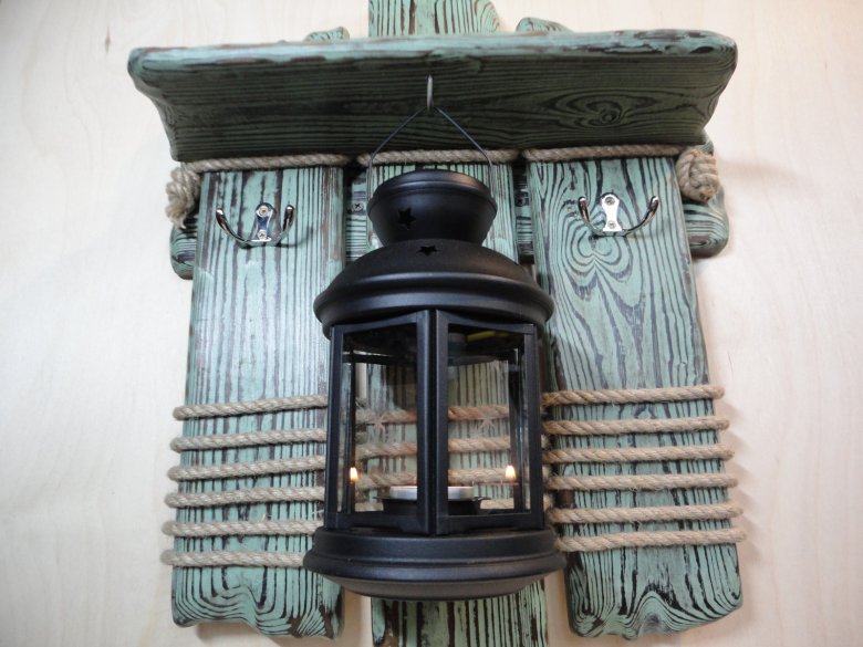 Пустил в ход остатки каната, повесил икеевский подсвечник и крючки (что бы был функционал - вешалка). Крючки правда нашел только такие. В будущем докуплю бронзовые.