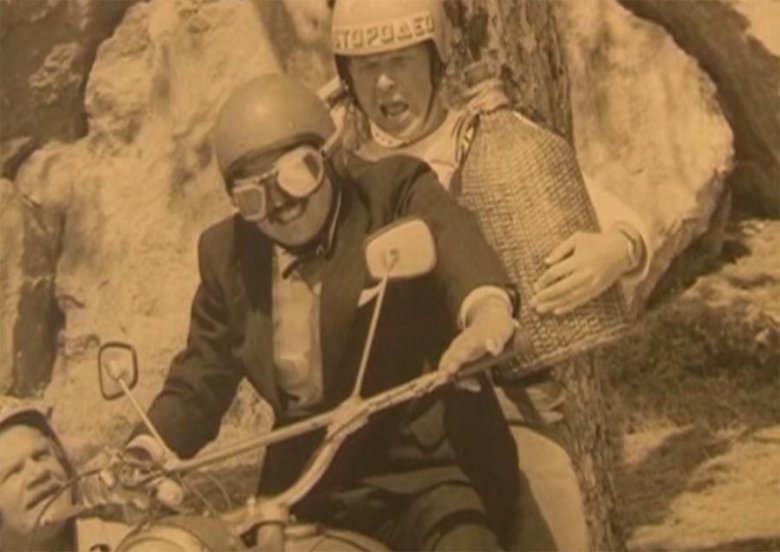 "Захватывающий кросс - по крутому спуску катится оплетенная бутыль, следом за ней несется мотоцикл. Беглянка все время ускользает от рук преследователей, никак им не удается ее схватить. Нужно обладать водительским мастерством К. Демахина, чтобы на большой скорости пройти столь сложную трассу. Игра с бутылью в "кошки-мышки" продолжается три с лишним часа. Режиссер, каскадеры и оператор придумывают все новые трюки, чтобы гонка выглядела на экране как можно забавнее. Три часа подряд оператор В. Абрамов, скрючившись, сидит в багажнике машины, которая мчится перед наскакивающим на коварную бутыль мотоциклом. А саму беглянку держит на двух огромных "удочках" расположившийся позади оператора ассистент...