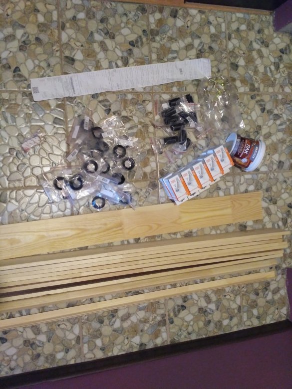 Доска струганая 2000х115х10, зеркало 550х600, лампочки LED 40W E14, лак и прочая мелочёвка. В общей сложности, тыщи на 3 вышло. (Зеркала на фото нет, оно ещё со вчера от жены сныкано)