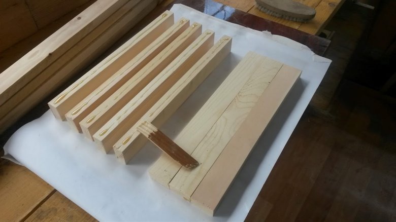 Склеиваю первый уровень царг, на которых будут лежать ламели. Клею предварительно выложив царги на малярный скотч.
