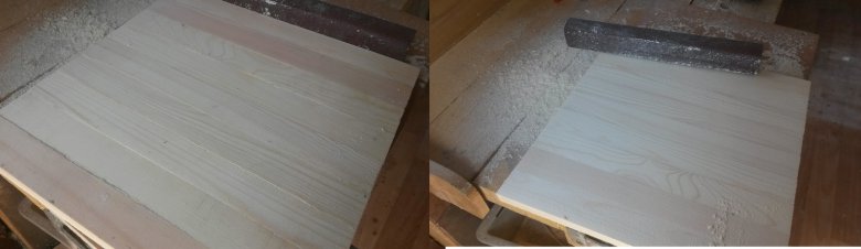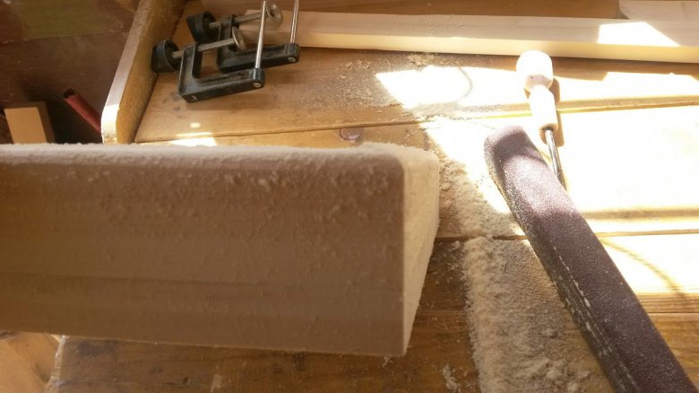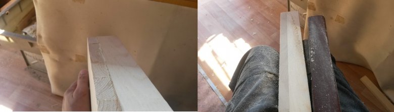 В следующий день выравниваю сиденье наждачной бумагой 32 гридности закрепленной на бруске. Такой скорости обработки я не ожидал, скорость съема выше чем ЛШМ со 120й, а принимая во внимание ширину бруска еще и ровнее. Древесина сухая, зерно крупное, практически не забивается (этот брусок дожил до окончания проекта и им еще можно работать и работать, практически не забился).
