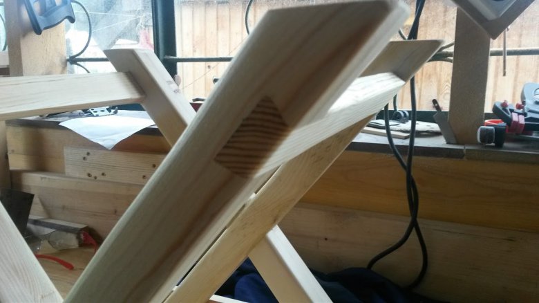 Так как шканты я не использую (дрель исключил из процесса изготовления), решил ножки соединить поперечинами, долго думал как это сделать, уж очень мне не хотелось заморачиваться с выпиливанием пазов. Тем более я допустил ошибку, я скруглил ребра на ножках, что добавляло проблем с разметкой. Но глаза бояться, а руки делают.