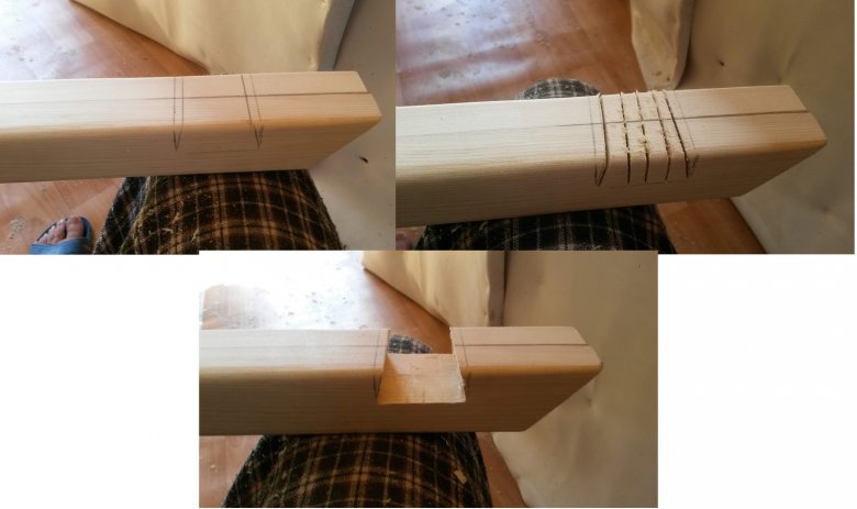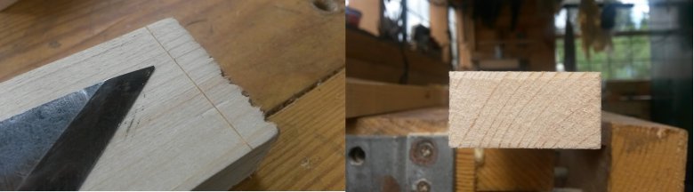 Первым делом решил запытать, не использовавшийся мною ранее способ пиления, а именно предварительная подрезка волокон. Как видно края реза получаются чистые, без отщеплений, да и начинать пилить проще, зубья пилы уже в канавке, не пытаются уйти в сторону.