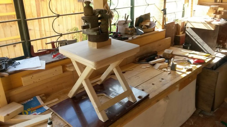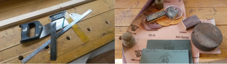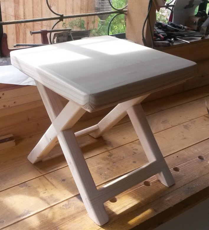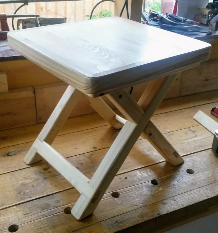 Я решил изготовить табурет с использованием только ножовки, ножа - косяка, наждачной бумаги и клея. Стамеска заменена на нож, дрель исключена. Я не профессионал и не хоббист, я любитель, которому нравится возиться с деревом. При изготовлении табурета использовалась наждачная бумага разной гридности, самое крупное зерно вроде 32, а также остатки кругов от орбиталки гридностью 60, 120, 180. Древесина - сосна, отрейсмусованные 6 брусков 20*40 по 2 метра на общую сумму 240 рублей приобретена в магазине.