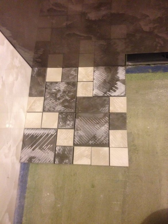 Вроде ничего. Теперь волю в кулак, туда же терпение, боль в спине, и потихоньку, ручками, плитку за плиткой. Около 300 штук клеим на пол