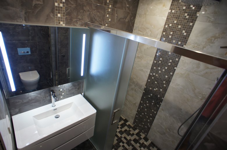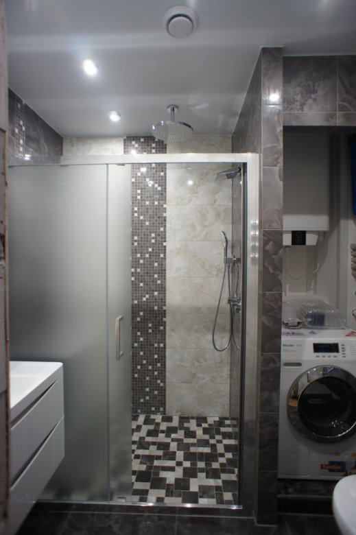 Дело за малым - затирка швов. Поскольку, как вы помните, клиент продал почку, денег осталось еще на эпоксидную затирку. Она по многим показателям лучше цементной, но, как всегда, случилось маленькое западло :) Немного затирки попало в шов скрытого люка, причем незаметно и внутри. В итоге, дверь приклеилась :) При попытке ее уговорить открыться, плитка тихо сказала "бзынь".... да твою ж маму...