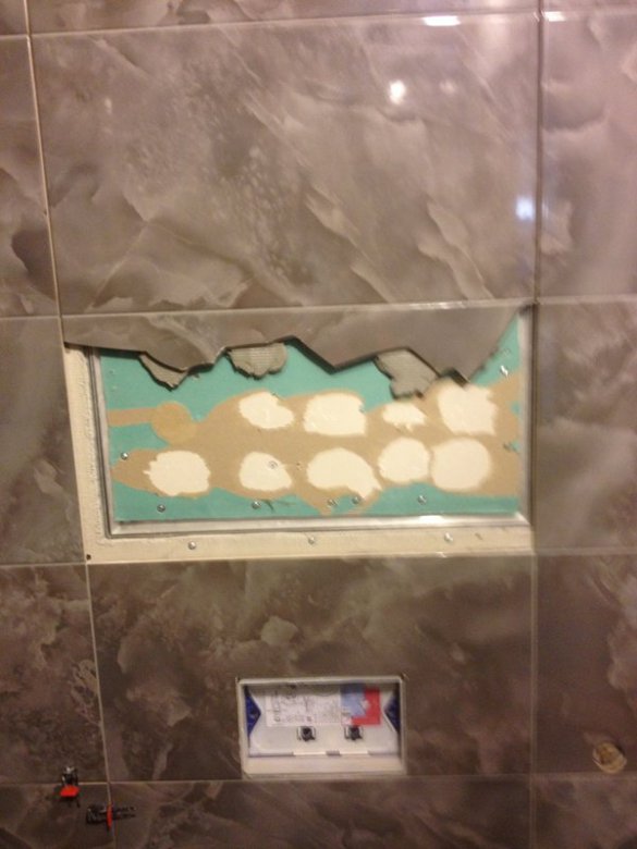 Плачем, отковыриваем кусочки, вычищаем все, укрепляем гкл, клеим новую. И не материм меня, что я, колхозник, клею плитку на ляпки. В случае со скрытым люком это сделано специально - уменьшить общий вес и нагрузку на дверь. Вся остальная плитка - под гребенку.