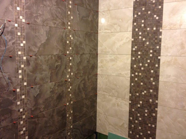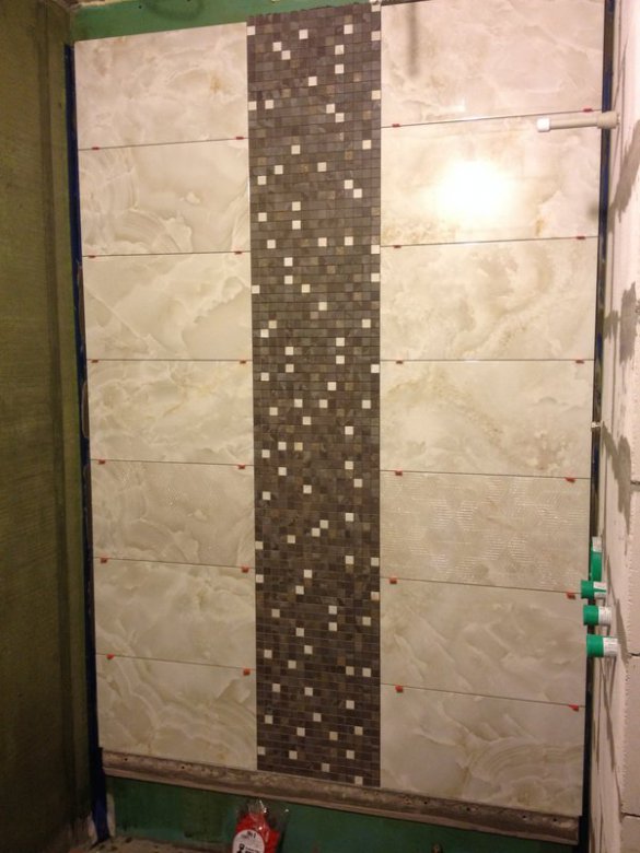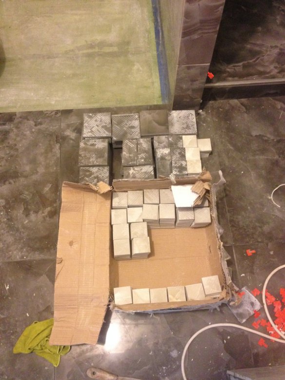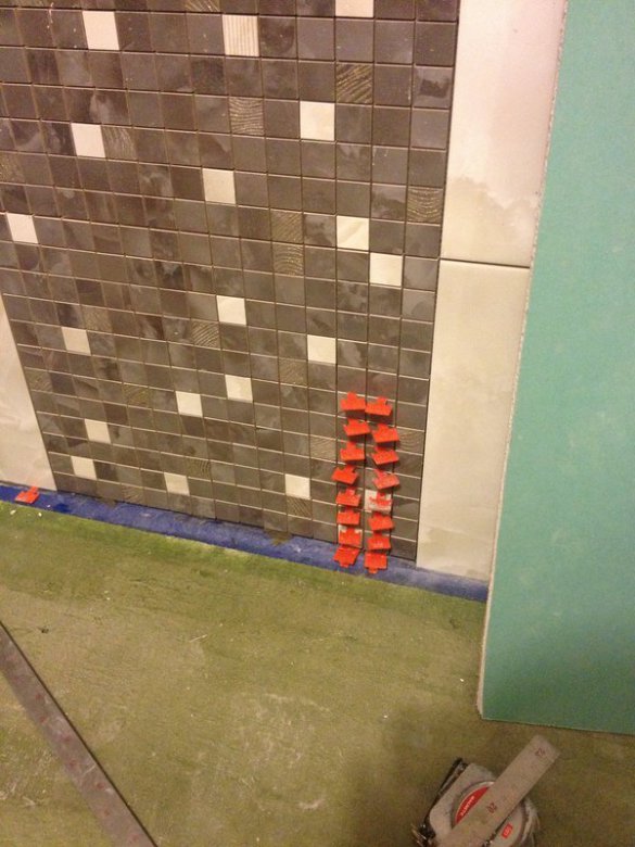 Пока стяжка набирает прочность - делаем гидроизоляцию стен и начинаем клеить плитку. В оригинале у атласа темная мозаика, поэтому, выковыриваем некоторые чипы и разбавляем светлыми, из этой же коллекции