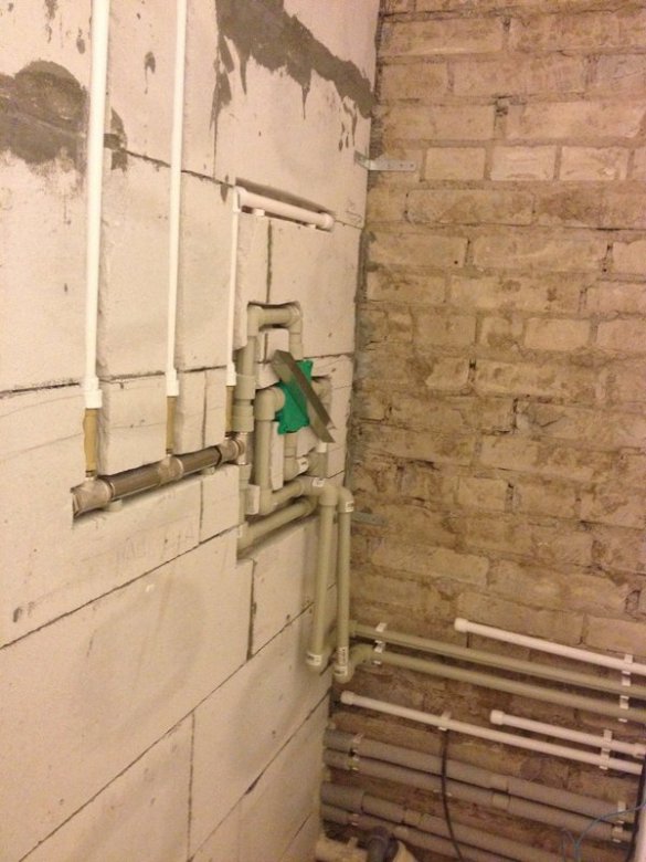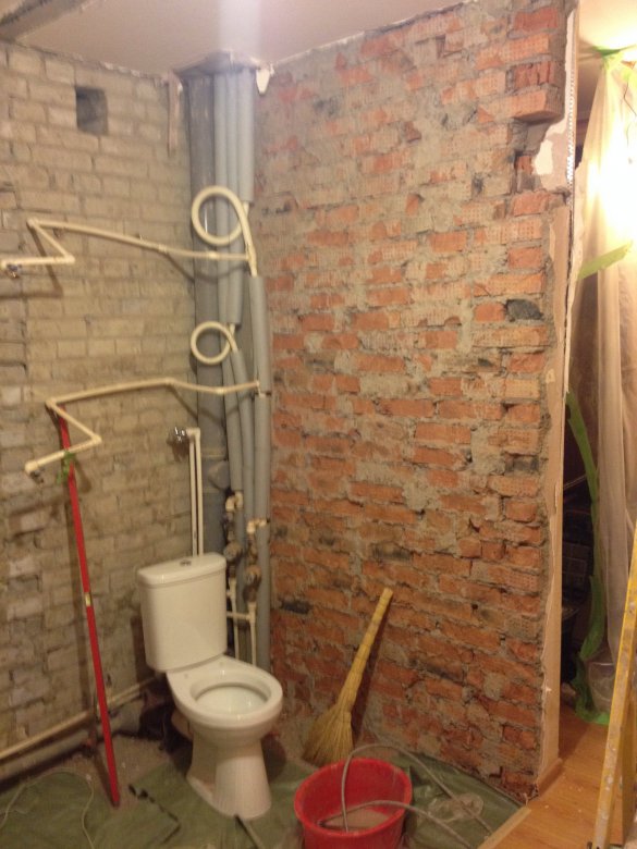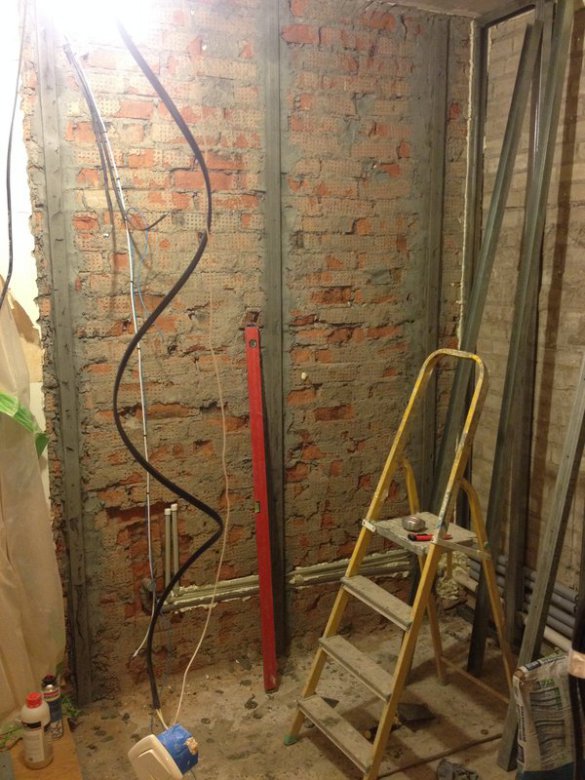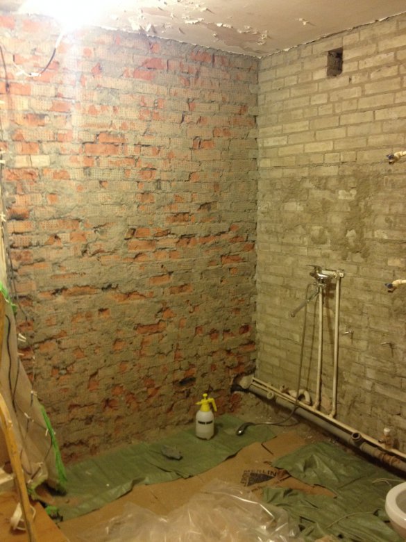 Неприятность №1 - стенка из белого кирпича. Это силикатный, мать его кирпич :( К нему очень фигово липнет что угодно, у него дикое водопоглощение, которое портит свойства любого клея. Решаем не дергать судьбу за тестикулы - в душевой кабине сделаем фальш-стену из ГКЛВ, а в хоз. отсеке с бойлером и машинкой пристрелим лист аквапанели. Перегородка между душевой и хоз. блоком, а так же новая внешняя стена - из газобетона. Левая стенка - нормальный кирпич, поэтому ее просто штукатурим по маякам. Правая стена закрывается ГКЛ, в ней прячется инсталляция, каналья, трубы коммуникаций.