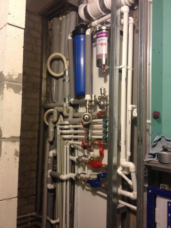 Клиент захотел себе коллектор, чтобы каждому потребителю шла своя линия и все перекрывалось централизованно. Плюс, куплен центральный термостат Hansgrohe highflow повышенной производительности, поэтому ему персонально трубу на 3/4. Делаем: