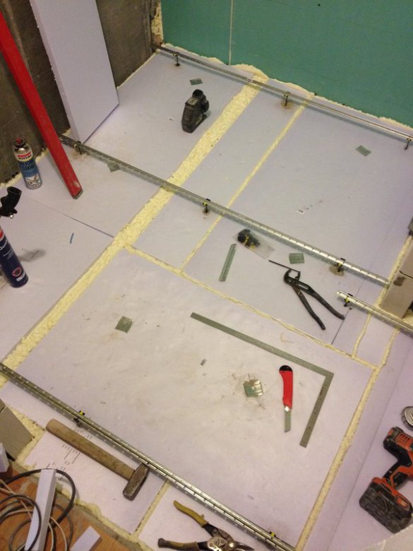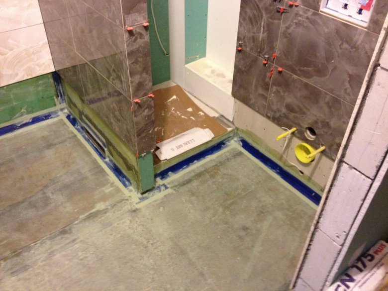 Пока клеилась плитка, стяжка дошла до кондиции, когда на нее можно наносить гидроизоляцию. Обычно на сплошные поверхности наношу зеленую из одного известного строительного магазина ЛэМэ, а на все стыки (стена-пол, стена-стена) - прорезиненную ленту, которая хорошо тянется, и, даже если появятся трещины или стена подвинется - вода все равно не пройдет. Предпочитаю mapeband, не сочтите за рекламу, лучшее из того, что можно купить у нас. Вот это синее - оно.