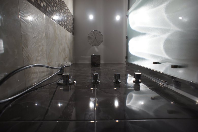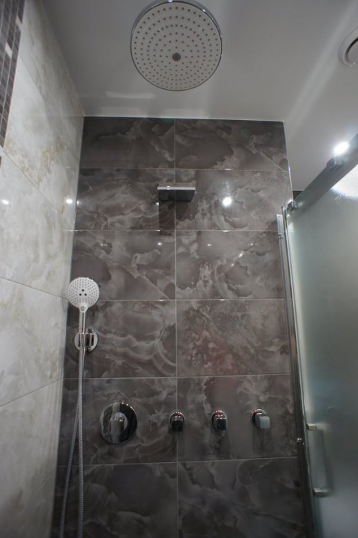 Заводим коммуникации в душевую. У нас там будут в наличии: центральный термостат, ручная душевая лейка на 3 режима, стеновая лейка "водопад" и верхний тропический душ, опять же, на 2 режима. Вся эта радость может запросто выливать 50-60 литров воды в минуту, поэтому для нее отдельная трасса