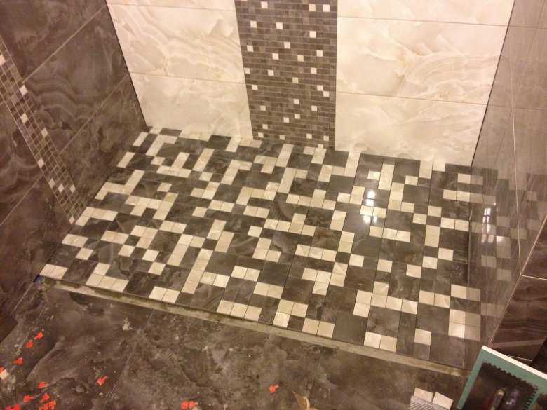 Начинаем укладку пола. Основная часть - керамогранит 60х60. А вот с душевой проблема - нормальный разуклон с такой плиткой не сделаешь, да и скользкая она слишком для душа. Поэтому берем две коробки этой радости ,и везем на гидроабразив, где нам напилили разных квадратов и прямоугольников