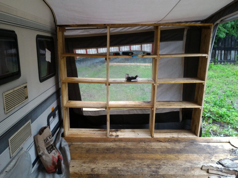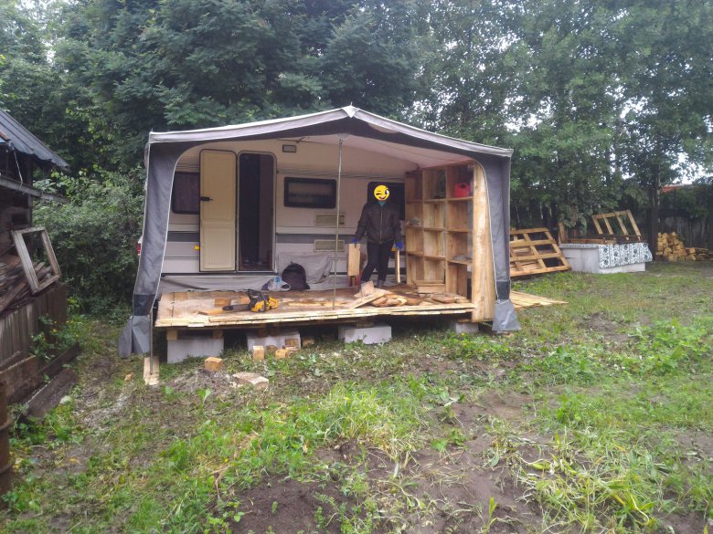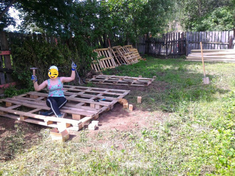 Из поддонов и пеноблоков сделали подиум, сколотили досками, и поставили палатку, сколотили полки для хлама. Криво, косо. Но до зимы точно простоит)))