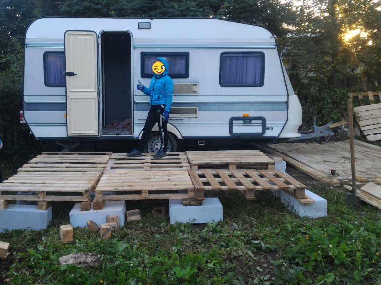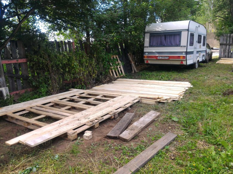 Поставить решили стационарно. "Фундамент" сделали из березовых поддонов, усилили места где будут стоять колеса с помощью деревянных кубиков. В местах опуска "ног" поставили пеноблоки.