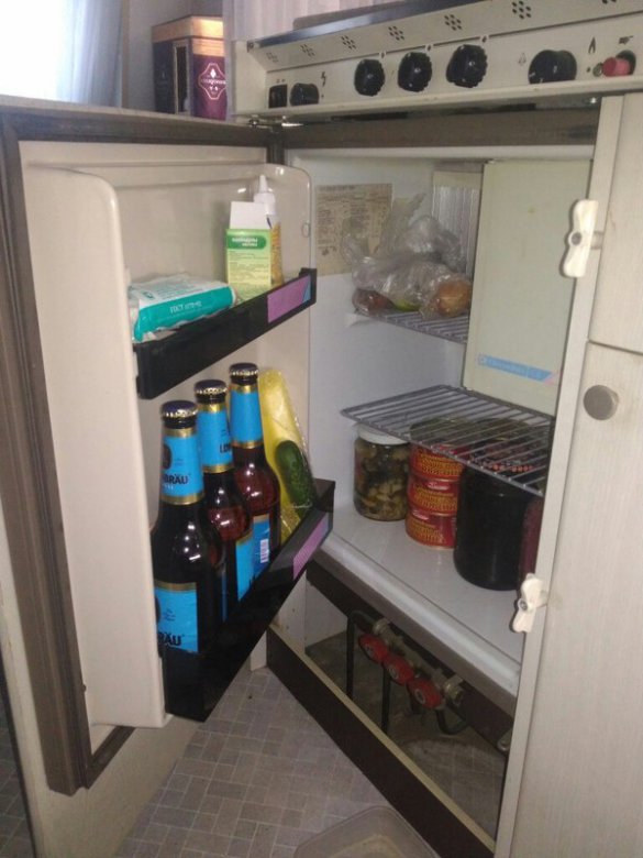 Холодильник (работает от 220В, 12В или газа) Используем как шкаф, так как довольно маленький. Купили большой холодильник и поставили в пристрое.