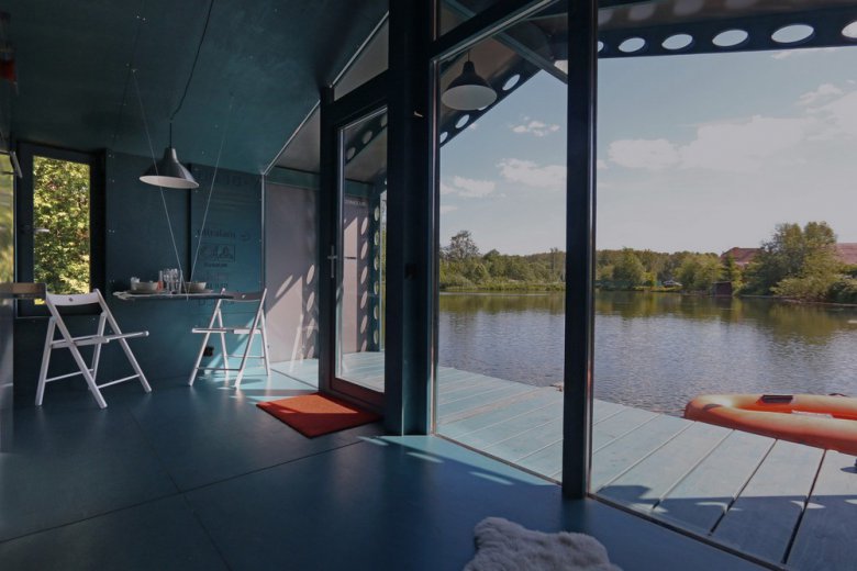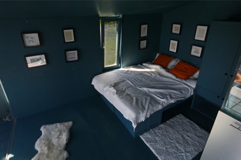 Общее пространство домика составляет 16 квадратных метров. Пока это только прототип и разработчики еще тестируют, какая оптимальная площадь необходима для комфортного пребывания на воде. На сегодняшний день в комнате есть двуспальная кровать и кухня, а также ванная комната с душем. Несмотря на компактные размеры, огромное окно визуально расширяет пространство, стирая границы между комнатой и окружающей средой.