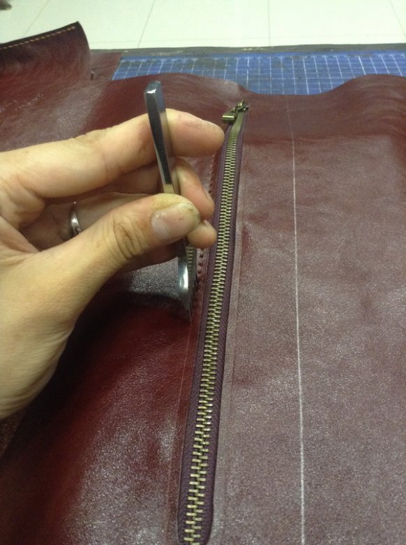 И также вшиваем молнию в карман с задней стороны, заодно делаем ручку, укрепляем её
