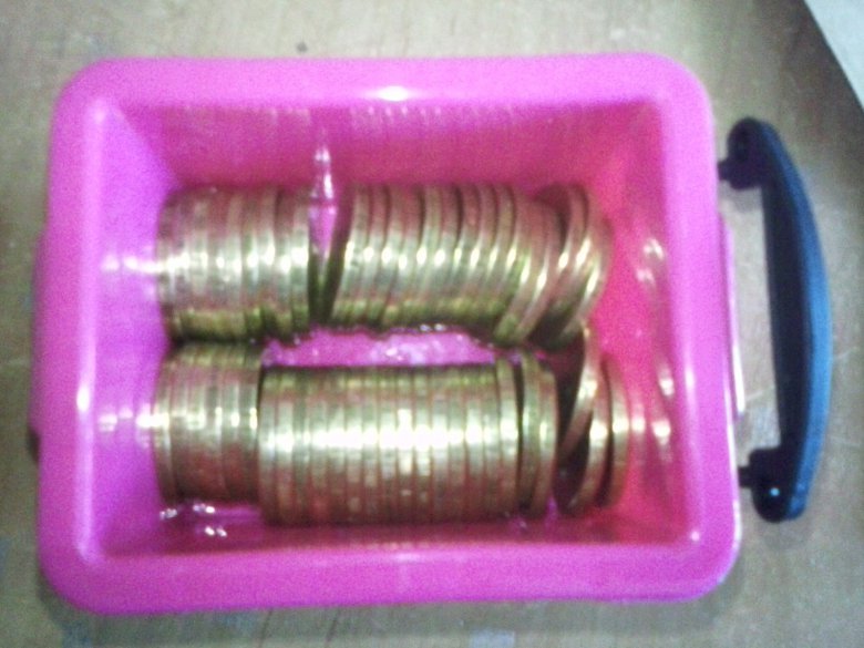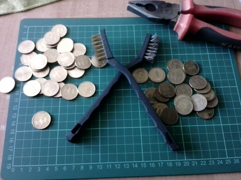 Начал с "золота". Какой же клад без золотых монет? Разменял в банке деньги по 10 рублей и принялся их чистить. Лучшим вариантом оказалась щётка-крацовка с не очень жёсткой "щетиной"