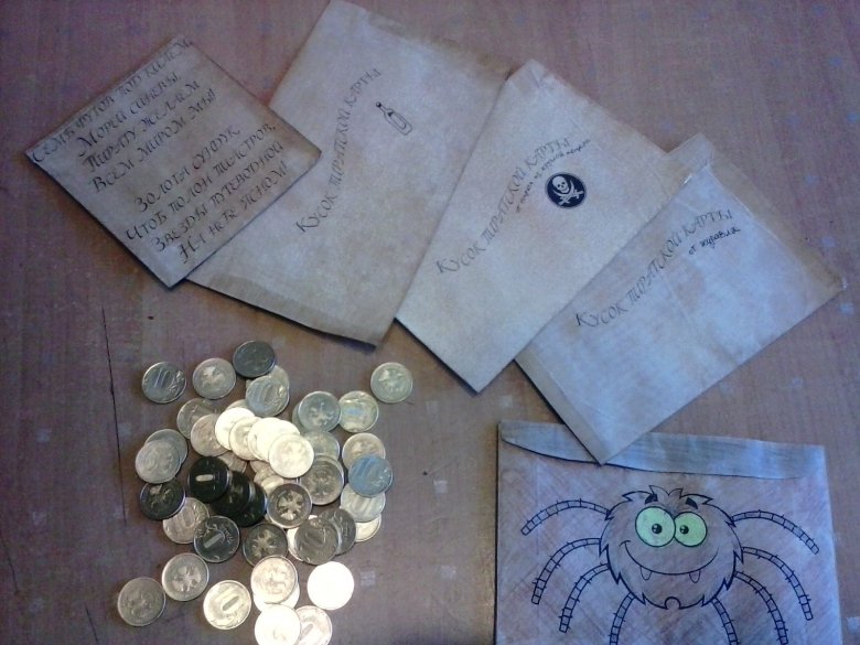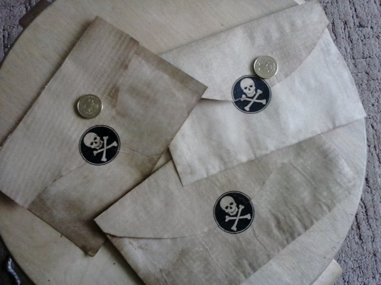 Вот и всё. Куски карты разложены по конвертам, а для "пещеры" состряпал и вырезал вот такого пирата, чтобы он "держал" один из конвертов.