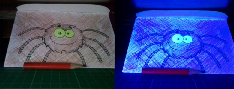 В качестве паука в кладовке решил использовать конверт с изображением паука. Ну и не забыл про "горят глаза его во тьме", и раскрасил глаза люминесцентным аквагримом (фломастеры тоже сгодятся, но их я не обнаружил).
